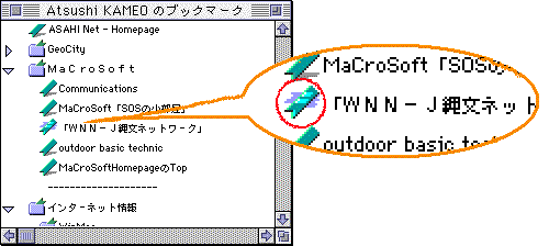 ブックマークやそのフォルダを登録しておいて、好きなときにチェックできる、とかさ。「最終訪問日時」から判断して、これは毎日チェック、これは3日おきにチェックとかって登録できるともっといいなあ。誰か、HyperCardかAppleScriptで挑戦しない? しないか(^^ゞNNにしてもNCにしてもMS-IEにしても、こーゆーちょっとした使いこなしとかって、みんな知ってるのかなあ? きっと「マニュアル本」にもヘルプファイルにも出てるんだろうなあ。雑誌にもあるのかもしれないね。わたしはそうゆうのは見てないので、知らなかったのでした(^◇^;)