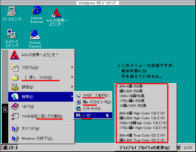 こりゃあよかった、と喜んだのもつかの間。今度はAOLにアクセス〜画面解像度の変更、ってなことをするとWindowsのFinder……じゃないな、何ていうんだ、まあそのタスクバーの「スタート」メニューとかが文字化けするようになった。