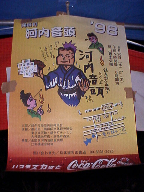 会場全景。昨97年から会場が移転し、錦糸町駅から徒歩数分の高速道路の下にある堅川親水公園会場で行われている。左右に出店が広がり、奥にステージがある。踊る場所は中央。このカメラ位置は人工芝で覆われており、間もなく弁当などを広げる人でいっぱいになった。カメラの背後に本部があり、手荷物預かり所やカンパの受付を兼ねている。